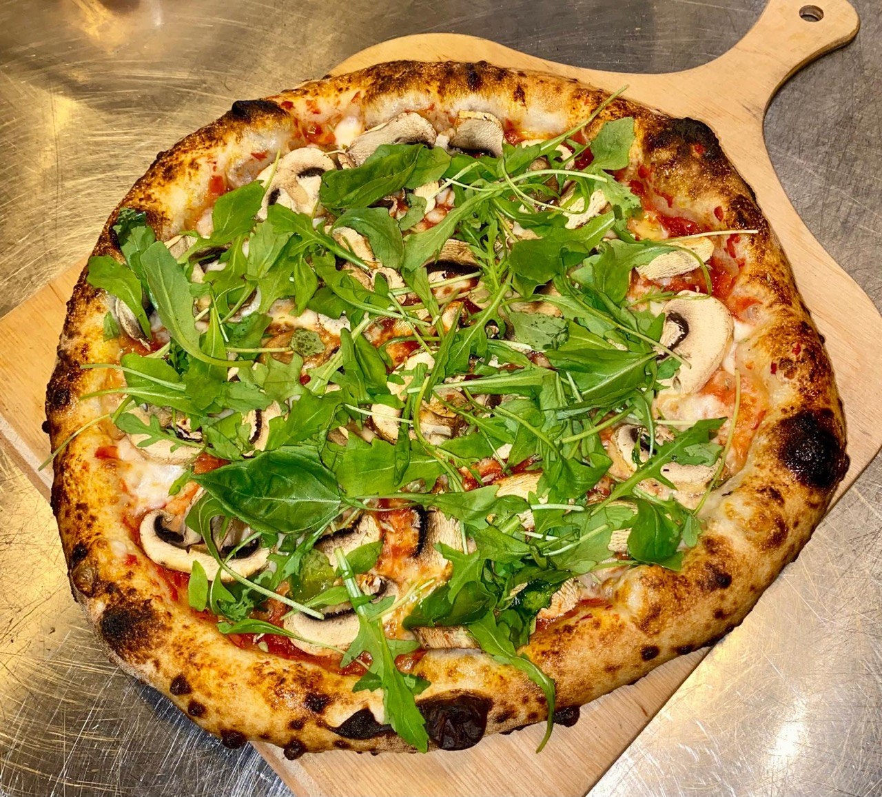 Com molho de tomate, mozzarella, cogumelos e manjericão