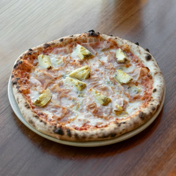 Tomate, mozzarella fior di latte, fiambre, queijo gorgonzola, alcachofras grelhadas e marinadas em azeite e azeite de alho